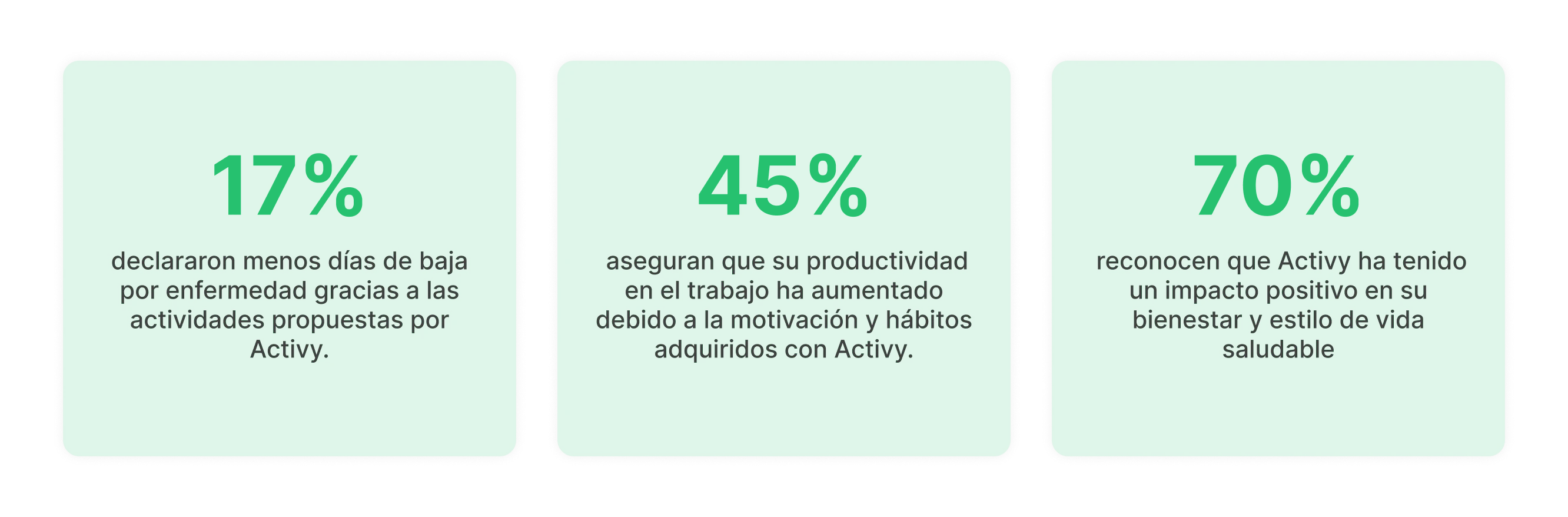 • 45% de los empleados aseguran que su productividad en el trabajo ha aumentado debido a la motivación y hábitos adquiridos con Activy.